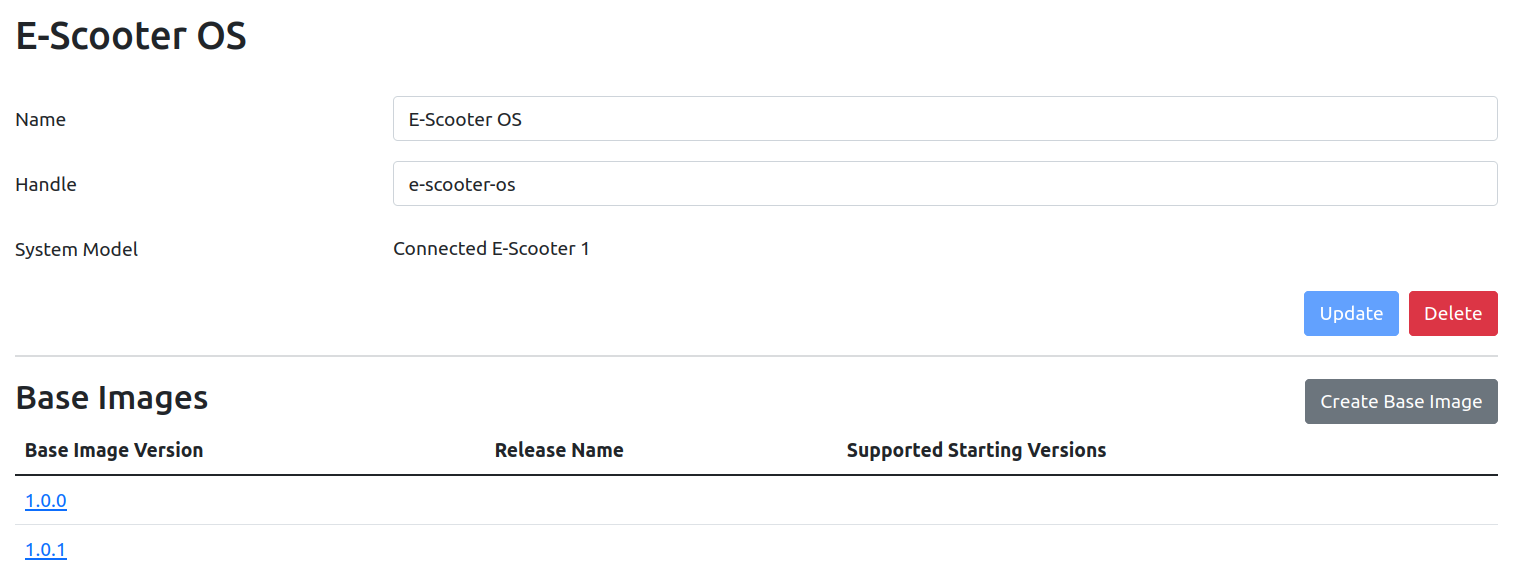 As mentioned in the OTA Update concepts, Base Image is an image created to be run on a Device. The exact content of the Base Image can vary depending on the use case, but it usually contains the operating system image or the device firmware. Each Base Image belongs to a Base Image Collection.